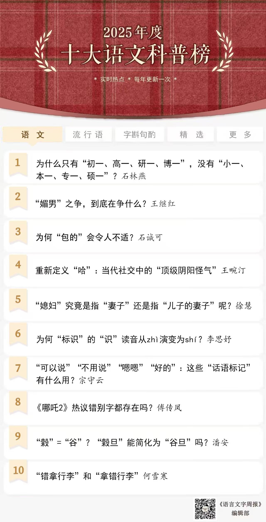 配合“十大网络流行语”推出,《语言文字周报》同时发布了“十大语文科普榜”,汇总本年度语文科普知识的最新讨论,更全面地呈现年度语言腔调,引领规范的语言文字风尚,构建开放、多元、包容的语文科普生态。今年的“十大语文科普榜”中既有引发热议的语文事件,也有汉语的新用法、新规律,还有习焉不察的语言习惯背后隐藏的知识点,一些与流行语相关的语文科普引起热议,比如“为何‘包的’会令人不适”“重新定义‘哈’:当代社交中的‘顶级阴阳怪气’”。