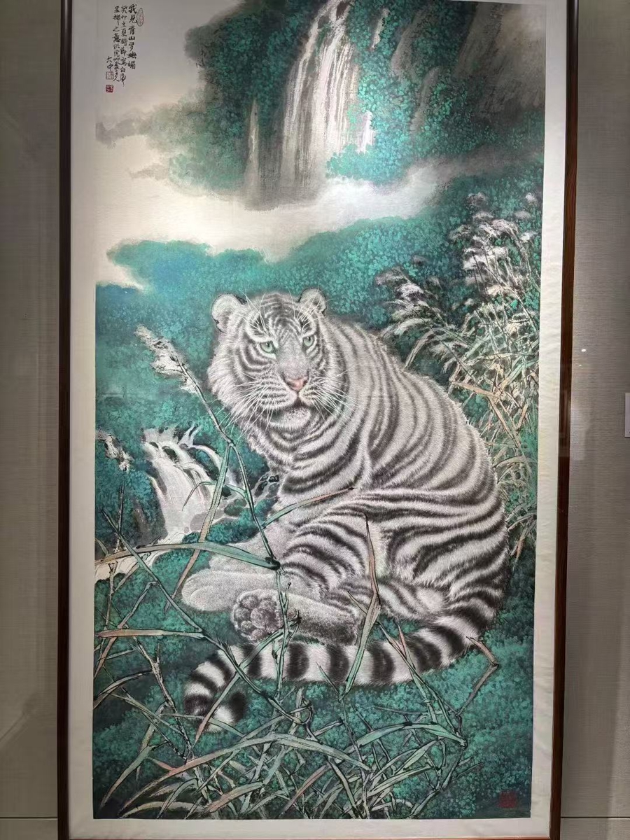展览现场,冯大中一系列以虎为主题的画作都是其历年画虎的经典之作,牵引了很多观众的视线。画中的虎或登高吟啸,或回眸露出温情。全身细致入微的刻画加上严谨写实的造型这些老虎焕然一新。冯大中坦言:“我都是从人性角度去表现老虎其美、其凶、其情。”另一些出现在展览中的山水画,则是冯大中的近作,写胸中丘壑,笔下西山。“在审美取向和追求上,我还是崇尚古典美。我在现实生活中汲取素材,试图表现这样的古典美。”冯大中说。